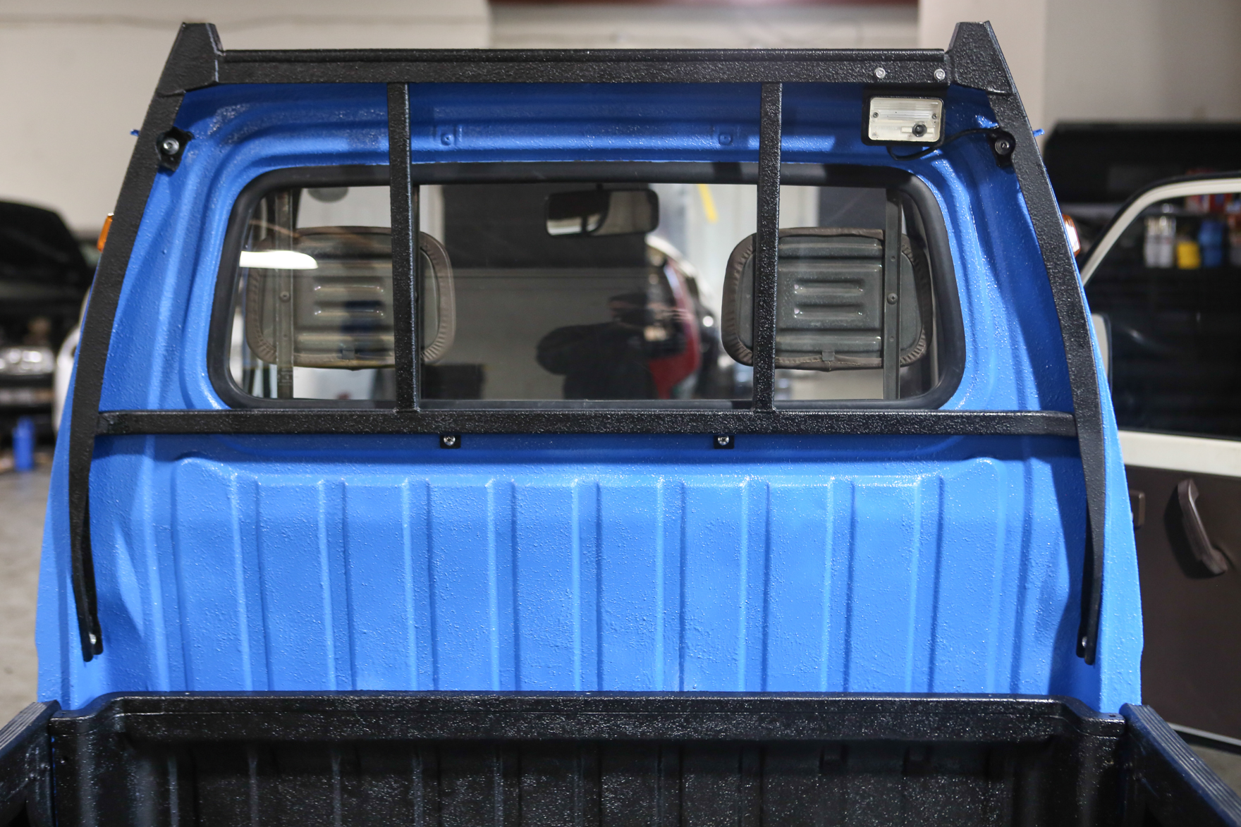 Heat, fan, defroster, manual roll up windows, windshield wipers, horn, hi-low beam headlights, tail lights, turn signals, 5speed manual transmission, bed with fold down sides
